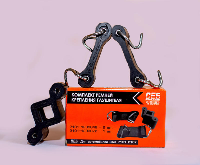 Комплект подушек глушителя 20Р из резины на ВАЗ 2101-2107 состоит из: ремень крепления 2101-1203047- 2 шт, подушка крепления 2101-1203072-1шт., упаковка пакет. Подушки служат для мягкого крепления системы выхлопных газов под днищем автомобиля.